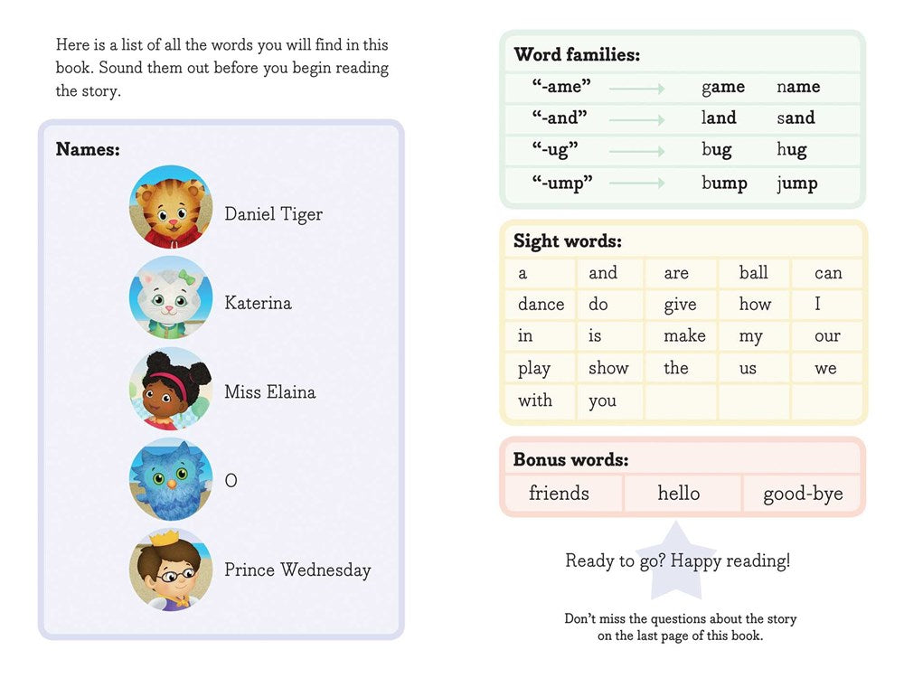 Each Ready-to-Go! Ready-to-Read includes a note to parents explaining what their child can expect, a guide at the beginning for readers to become familiar with the words they will encounter in the story, and reading comprehension questions at the end. Each Ready-to-Go! story contains no more than 100 words and will feature sight words, rhyming words, and repetition to help children reinforce their new reading skills. In this book, readers will learn twenty-three sight words and eight words from four word families. So come on and get reading with Daniel!