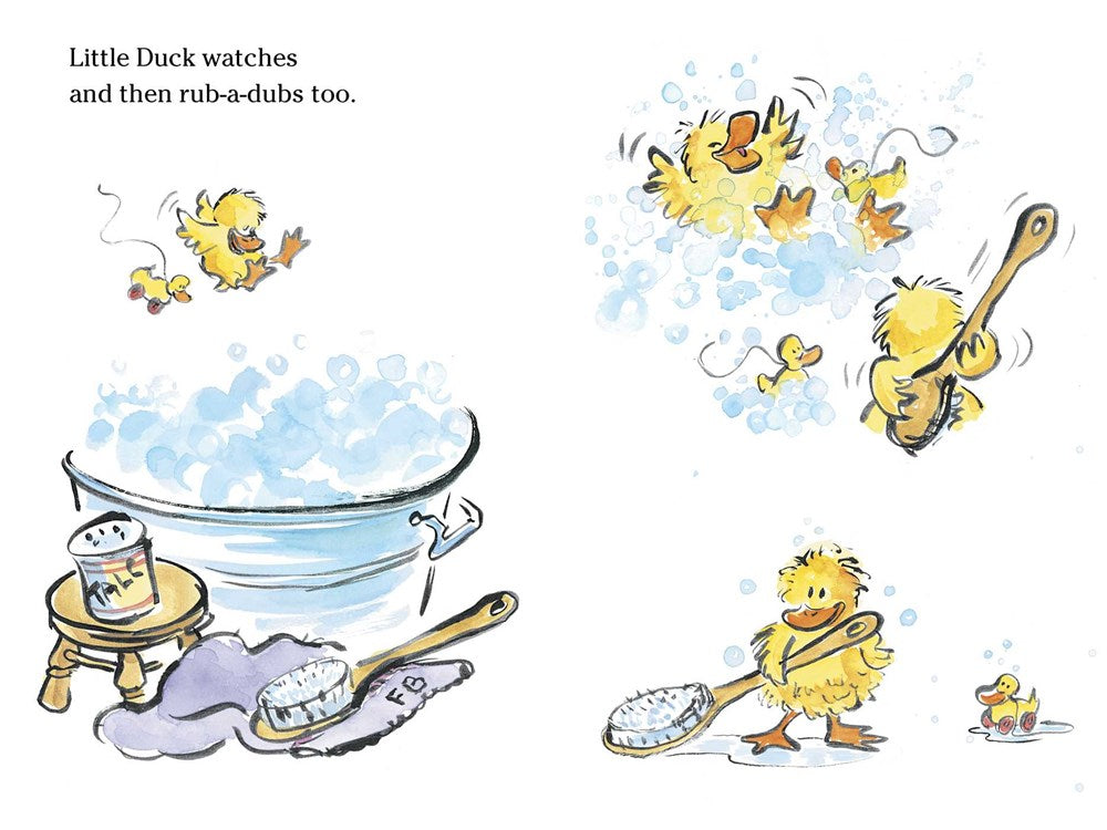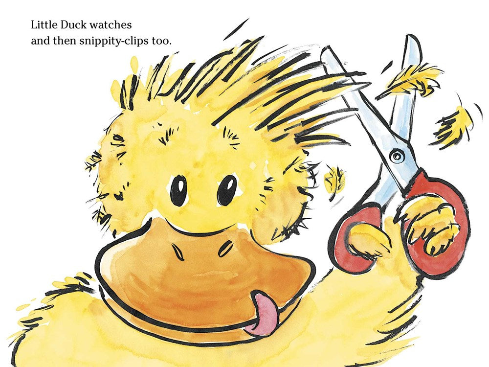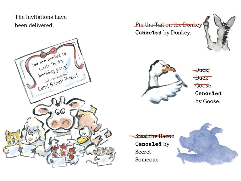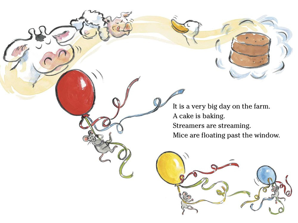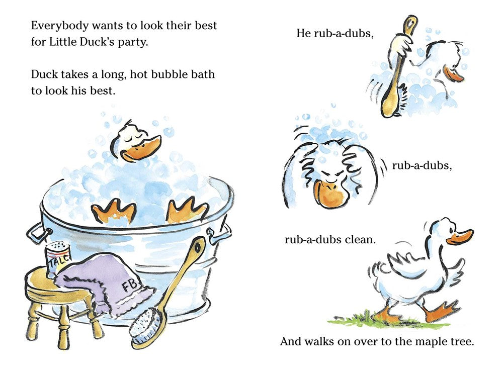 Everyone wants to look their best for the party. But Little Duck has never had a birthday before—so how better to learn how to prepare than to do what all the other animals do! The sheep trim their wool—so Little Duck trims her feathers. The pigs need a mud bath—so Little Duck squishes and squashes, too. All over the barnyard Little Duck snips, slurps, and shimmy shakes herself ready until...WHOOPS! It’s party picture time—and Little Duck is a big mess. No matter—it’s not something Farmer Brown’s frosted maple cake can’t fix!