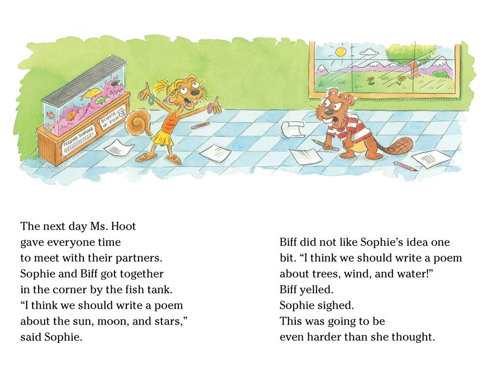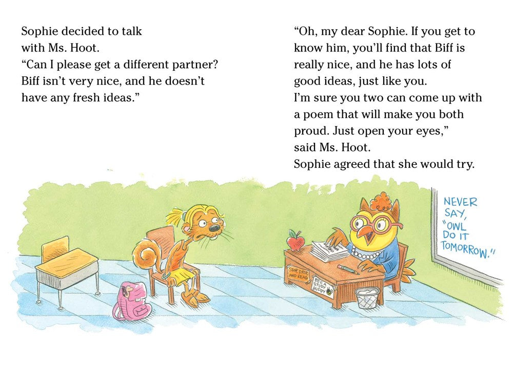 Ms. Hoot has assigned the class to write a poem, and everyone has to work with a partner. When Sophie is partnered with Biff, she is sure it’s going to be a disaster because Biff is mean! But as they work together, they find they have more in common than they thought.