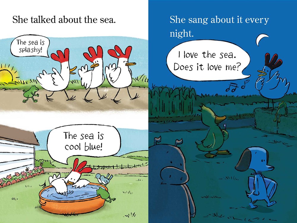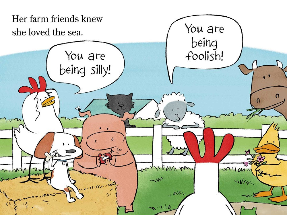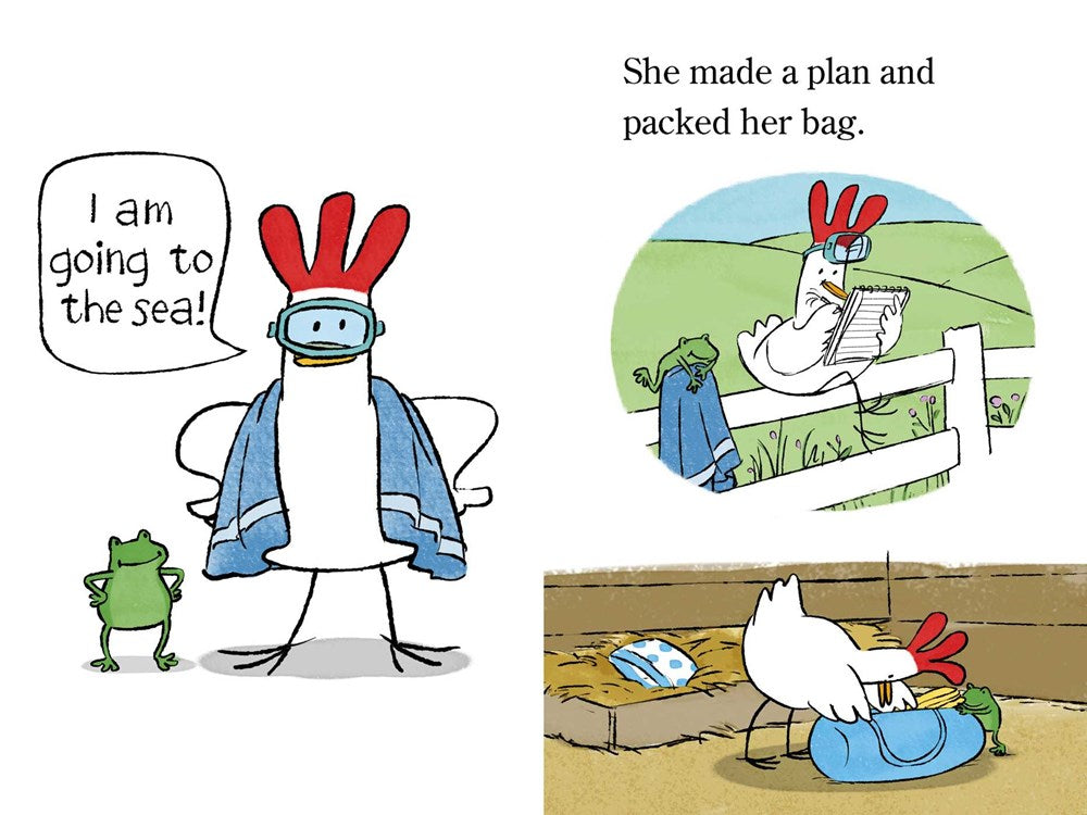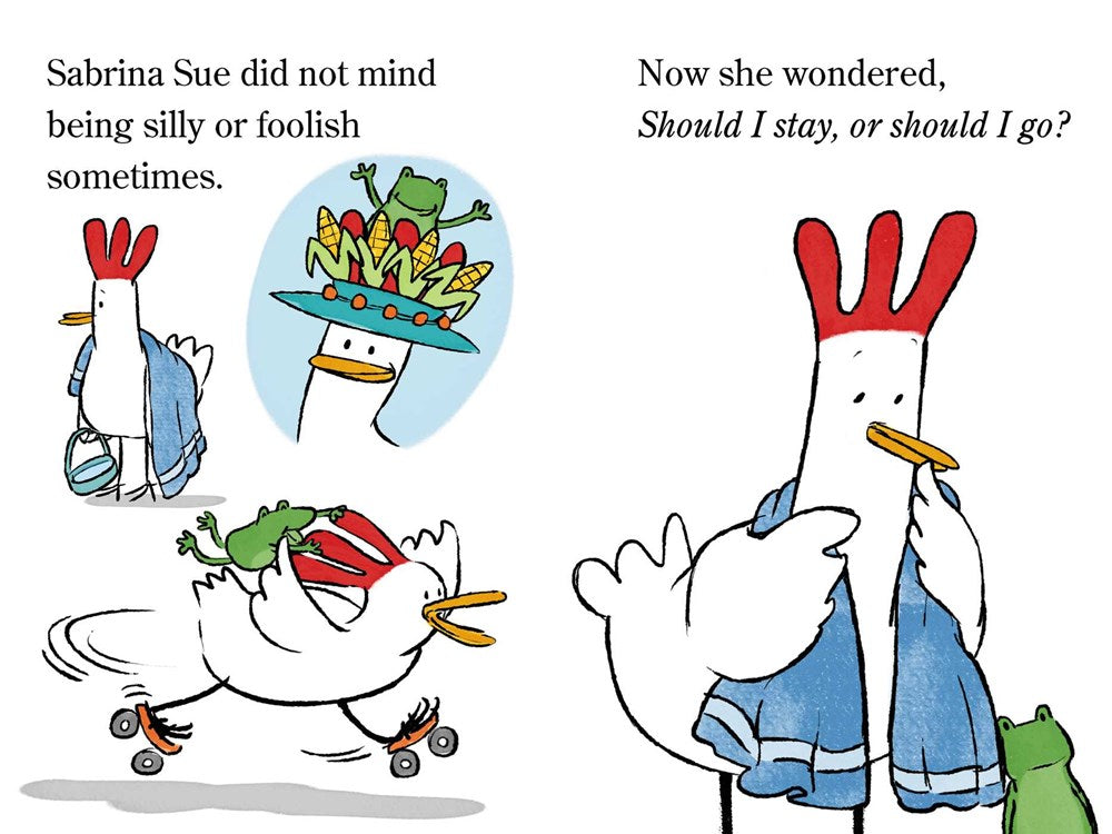 Sabrina Sue is a small barnyard chicken with big dreams. She wants to see the sea! The other animals tell her she’s being silly, that chickens belong on a farm. But Sabrina Sue thinks not following her dreams would be silly, and one day, she takes off on a wonderful adventure.