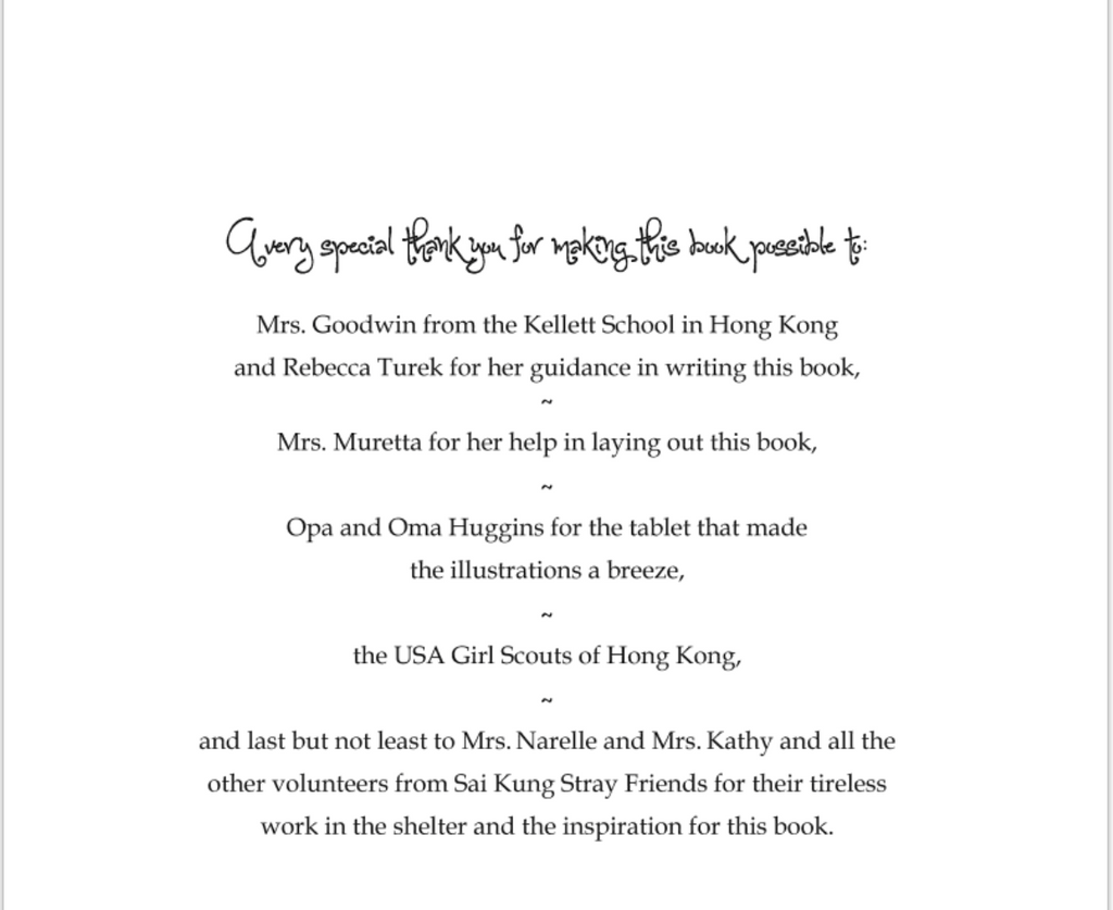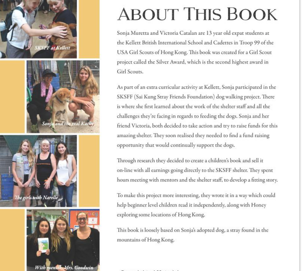 Follow Honey, the stray puppy, on an adventure as she travels with the help of Mrs. Kathy from various locations of Hong Kong to a shelter. Will she get adopted? Discover if she ends up with a forever family! This book is written and illustrated by two USA Girl Scouts for the benefit of the Sai Kung Stray Friends dog shelter, as they work to earn their Girl Scouts Silver Award.